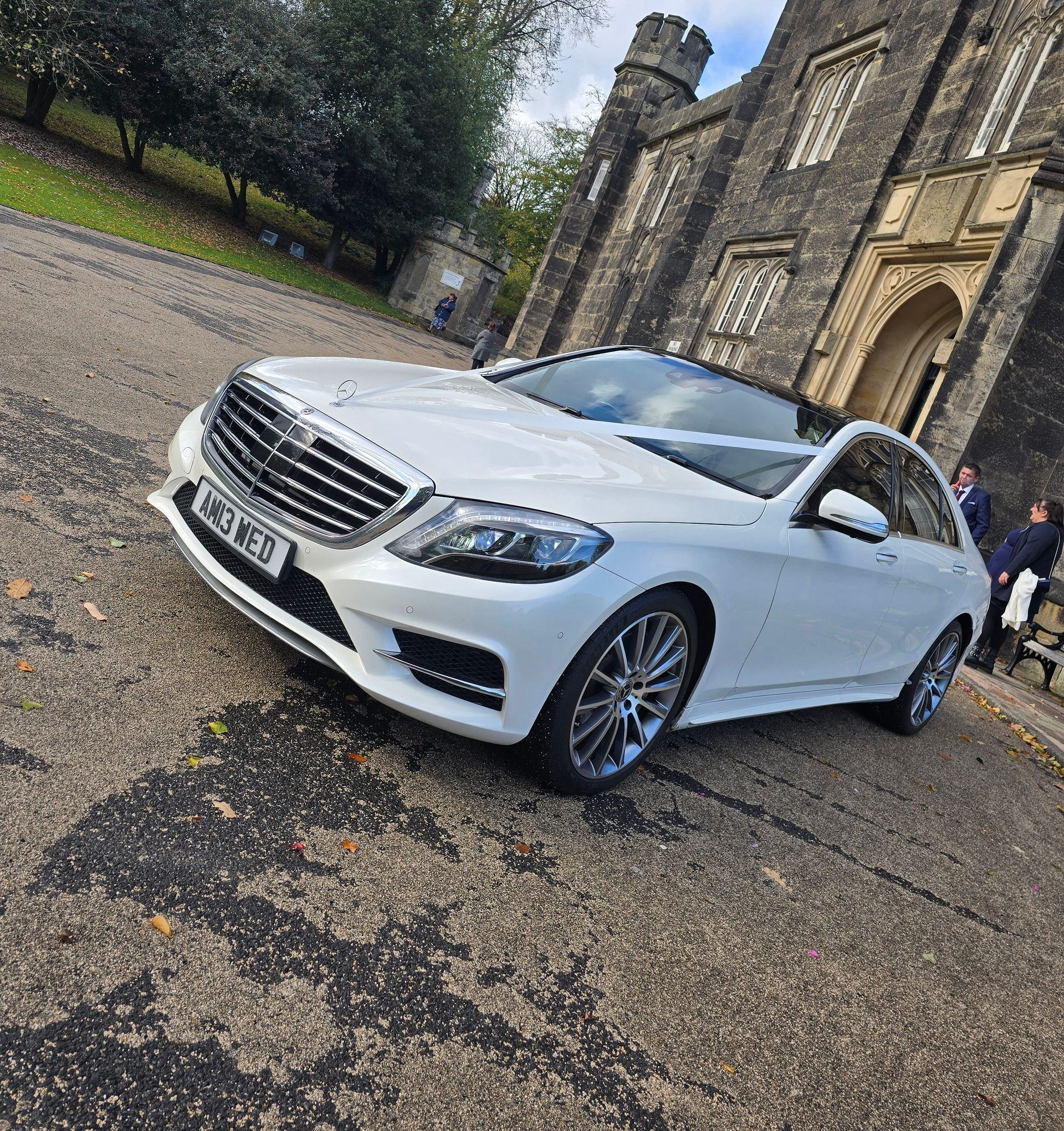 Our S Class Mercedes in diamond white is the perfect wedding car for a modern and stylish wedding. With white leather interior and colour mood lighting and heated seats this is spacious enough for your beautiful wedding gown and has a little compact mirror for those important make up touch ups.
